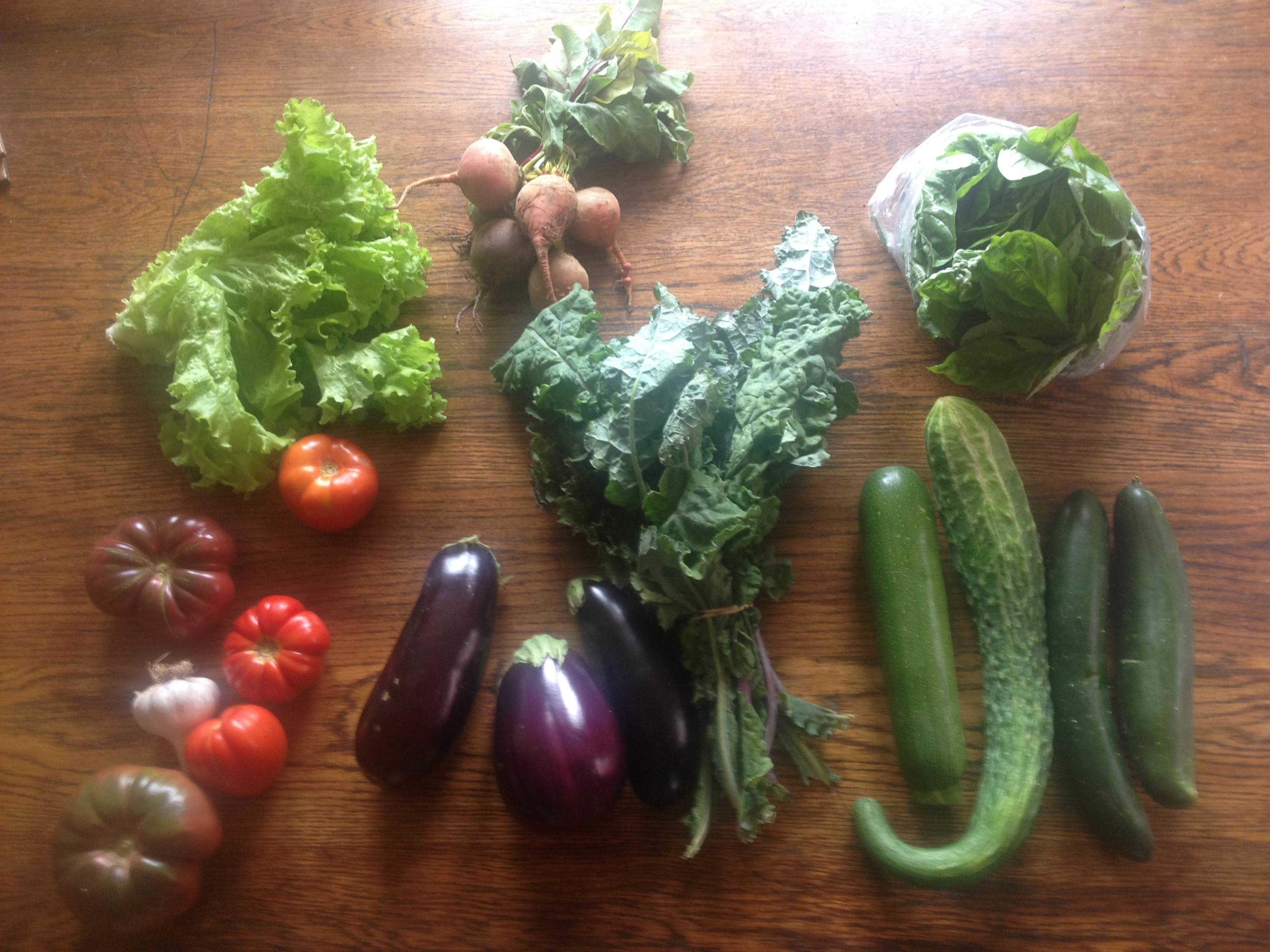 Whoops! I forgot to post this til now – sorry about that. A nice summer share Monday: A good array of five tomatoes, 3 med/large eggplant, 2 regular cukes + 1 asian cuke, 1-2 zucchini, bunch of rainbow lacinato kale, head of lettuce (various types), bunch of beets, 1 head of garlic, and a bag of about 1/2lb of basil.