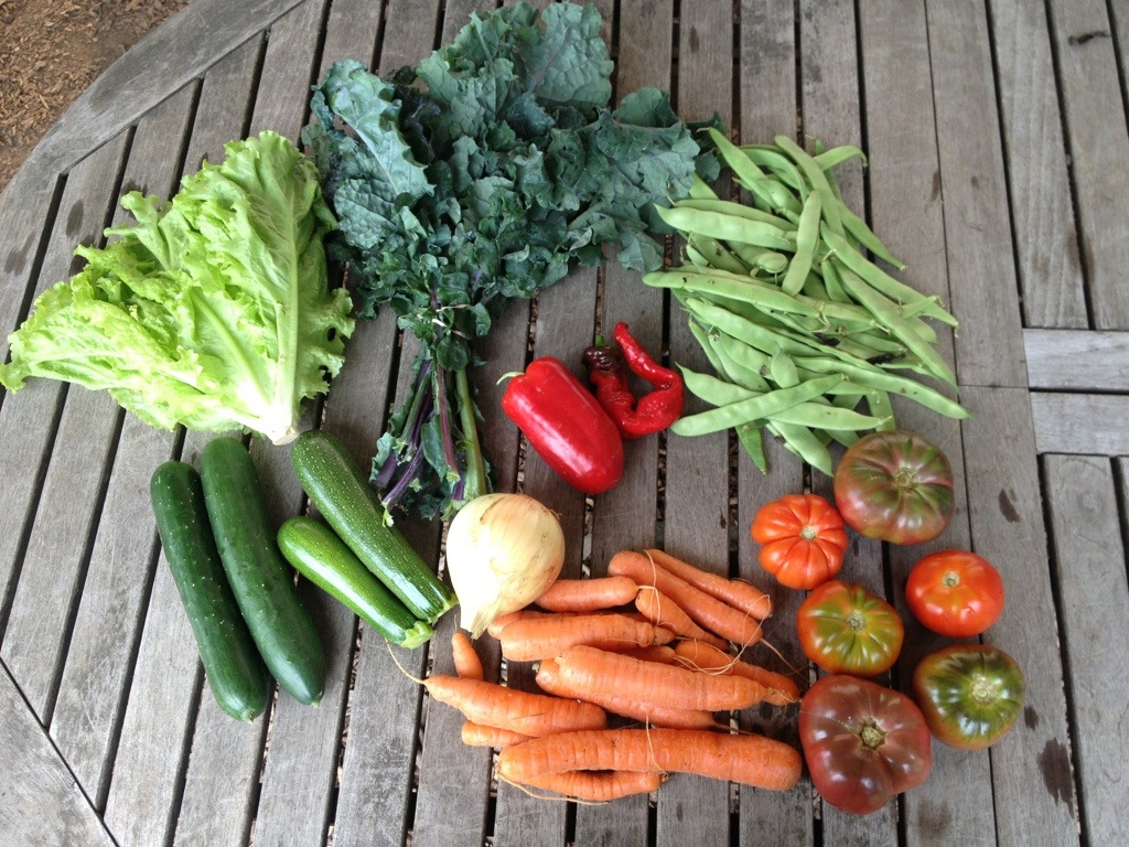 A colorful share today! First sweet peppers, first sweet onion, first romano green beans, plus some regulars: tomatoes, carrots, rainbow lacinato kale, lettuce head, cucumbers, and zucchini.