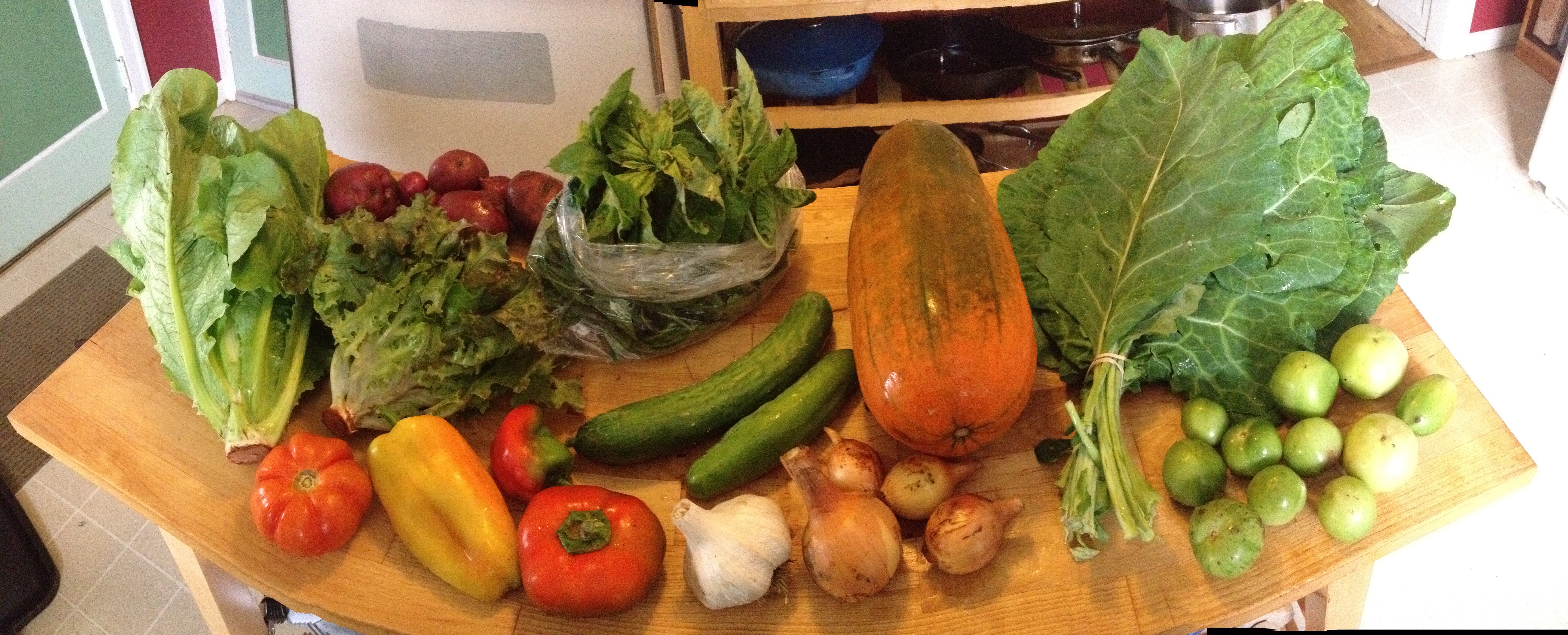 To fill out the share there are about 3 peppers, 1-2 ripe-ish tomatoes, two heads of lettuce (Parris romaine and “Sunset” is the red leaf), 2-3 cucumbers, a head of garlic to help you make pesto, a handful of small yellow onions (last of these).