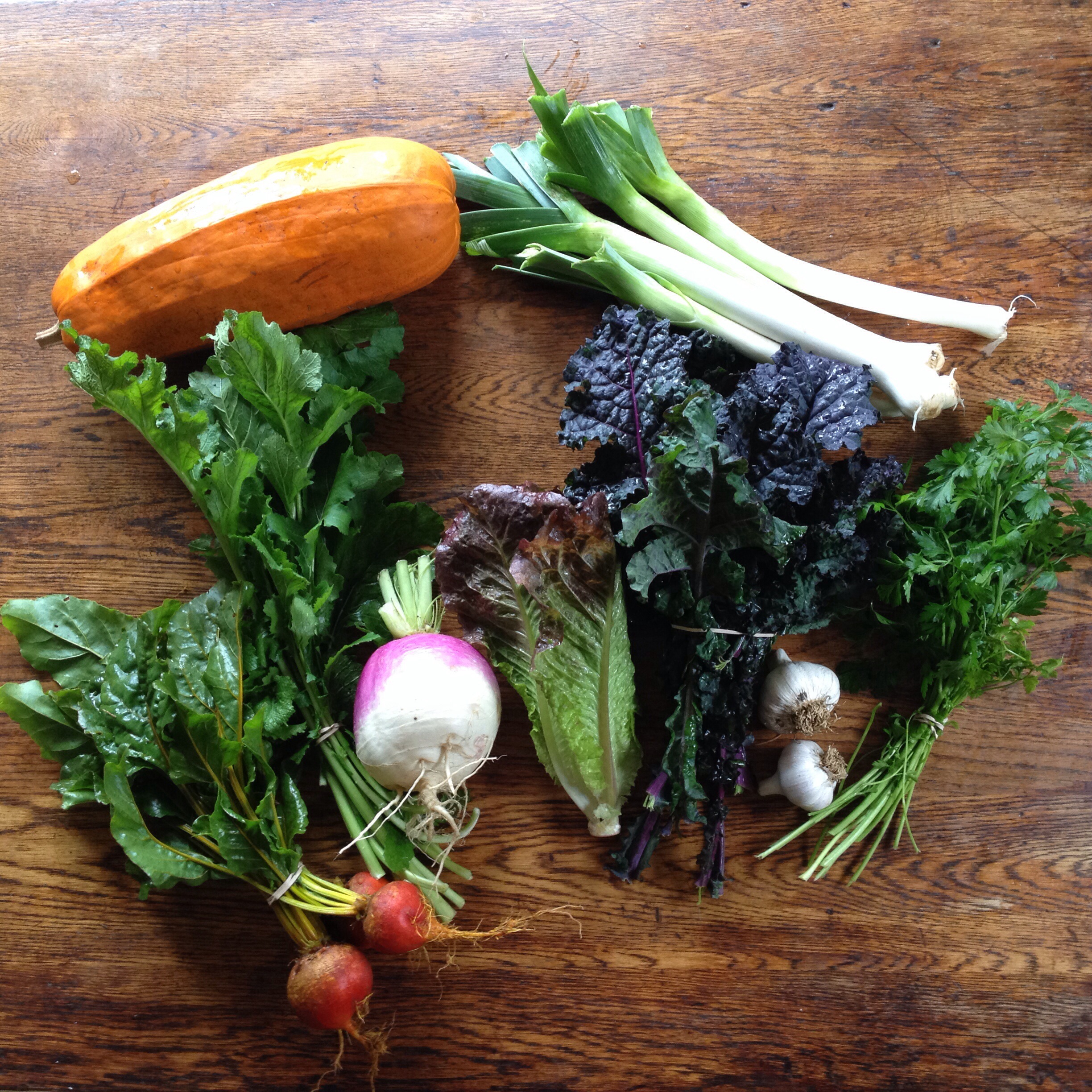 This share has the last of the lettuce (outredgeous variety), some golden beets, a purple top turnip or two, turnip greens, rainbow lacinato kale, a bunch of parsley (thanks to the kids garden!), 2 heads of garlic, 4 leeks (King Sieg is the new leek variety), and a long pie pumpkin (you’ve seen this one before). The last blog post has a pumpkin pie recipe. This pumpkin (and all the winter squash) will hold quite well at room temperature so if you want to save it for a Thanksgiving pie, it won’t mind at all.