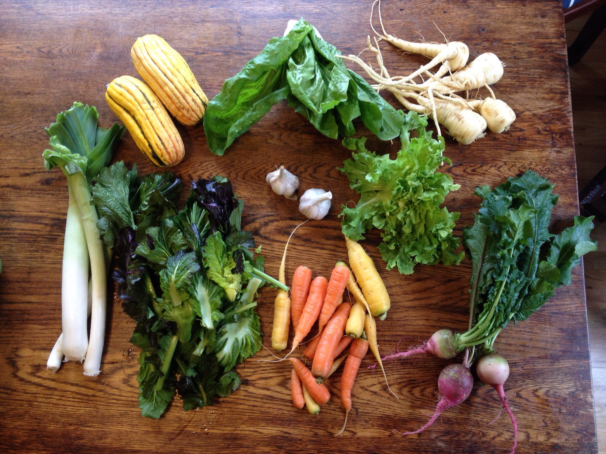 leeks, mustard greens, watermelon radishes (with edible greens), yellow & orange carrots, garlic, escarole, sugarloaf chicory, parsnips, delicata winter squash.