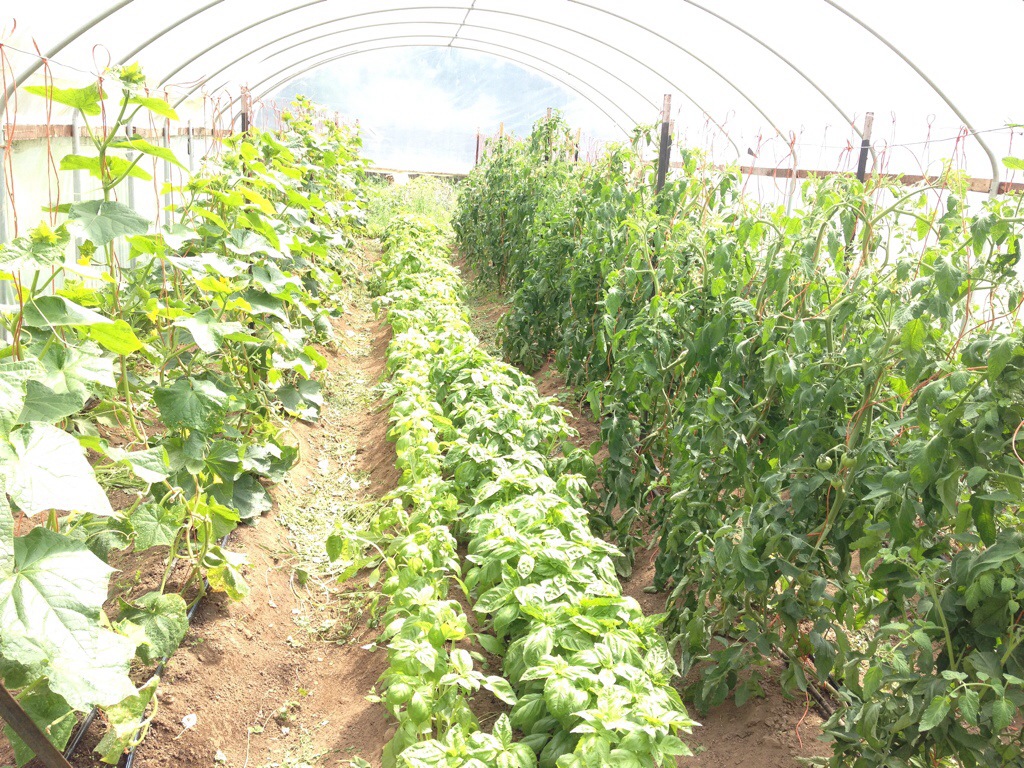 The (finally) trellised and weeded hoophouse of cucumbers, basil, tomatoes, eggplants, and peppers.