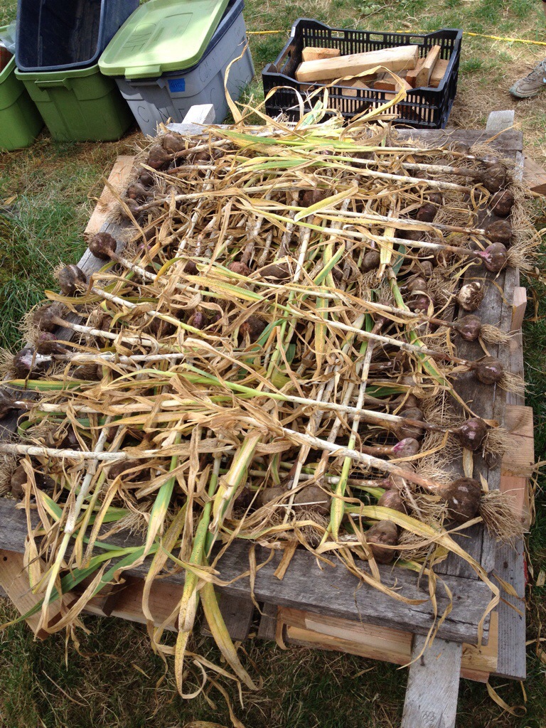 What else is going on at the farm? Garlic harvesting is underway. We pull out the bulbs with stalks attached and have laid them out to dry on screens in the shade as you see here. If rain threatens they will be covered or moved inside. After about 2 weeks they will be fully cured and ready for cleaning and storage.