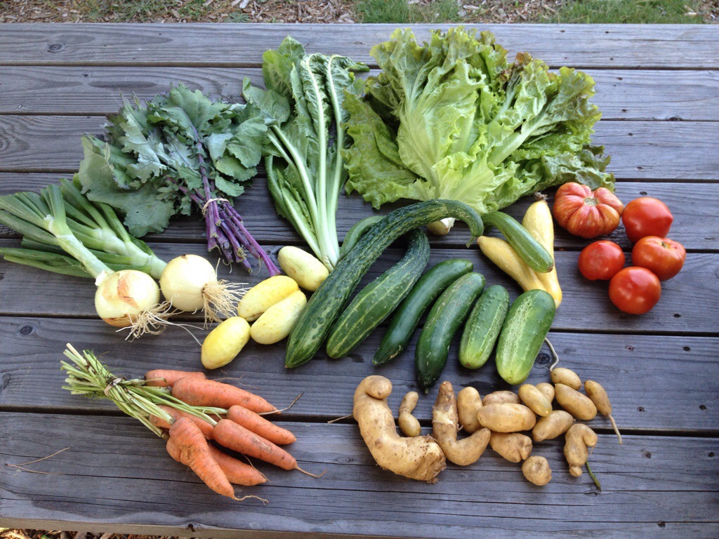 Kale is back in action in the share this week after a hiatus to recharge a bit. The tomato harvest is larger this week, making it really feel like summer on the farm now. Monday’s share had a head of lettuce in it. Thursday will not, but may have some cut lettuce mix instead. Cucumbers and summer squash/zucchini keep trucking along. Carrots are back this week too. Some new items this week: walla walla onions with tops, wild chicory greens, and fingerling potatoes. The walla walla’s as you probably know are sweet onions and their tops can be used like scallions. The chicory greens are similar to dandelion greens if you’ve had those. They are a bitter salad green (nice with citrus or nuts and cheese), or can be cooked (see below for an idea). Some of you may know that chicory root can be dried and ground for use as a coffee substitute, but did you know you can eat the tops? These bitter greens are related to escarole, radicchio, and frisee, and are super good for your digestion. The fingerling potatoes are the variety “Laratte” (same as last year) and I think they are about the tastiest potato I’ve ever had. Let me know what you think of them. Try cutting into thin slices, pan frying with oil and salt and eating with a few fried eggs for breakfast. That’s what I did with them this morning and it was incredible. Recipes recipes recipes!