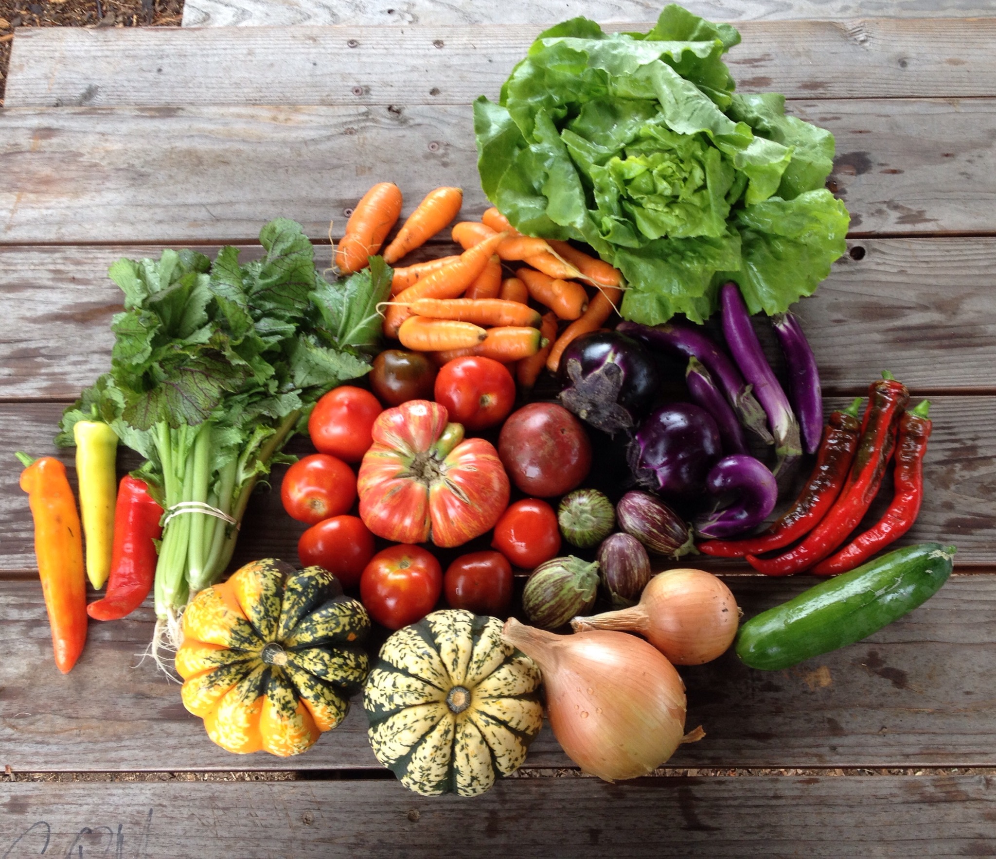I know the first thing you’re wondering is if any of these are hot peppers. And yes, the ones on the far left are Hungarian Hot Wax — not too spicy except for the seeds. The rest of the share is: a bunch of mustard greens for braising (try adding some apple cider vinegar or lemon juice or wine just near the end of braising), carrots, a head of lettuce, tomatoes galore, one cucumber, sweet jimmy nardello peppers (long thin and red), two walla walla sweet onions, 2 “Carnival” acorn winter squash, and EITHER a bunch of sweet peppers OR a bunch of eggplant.