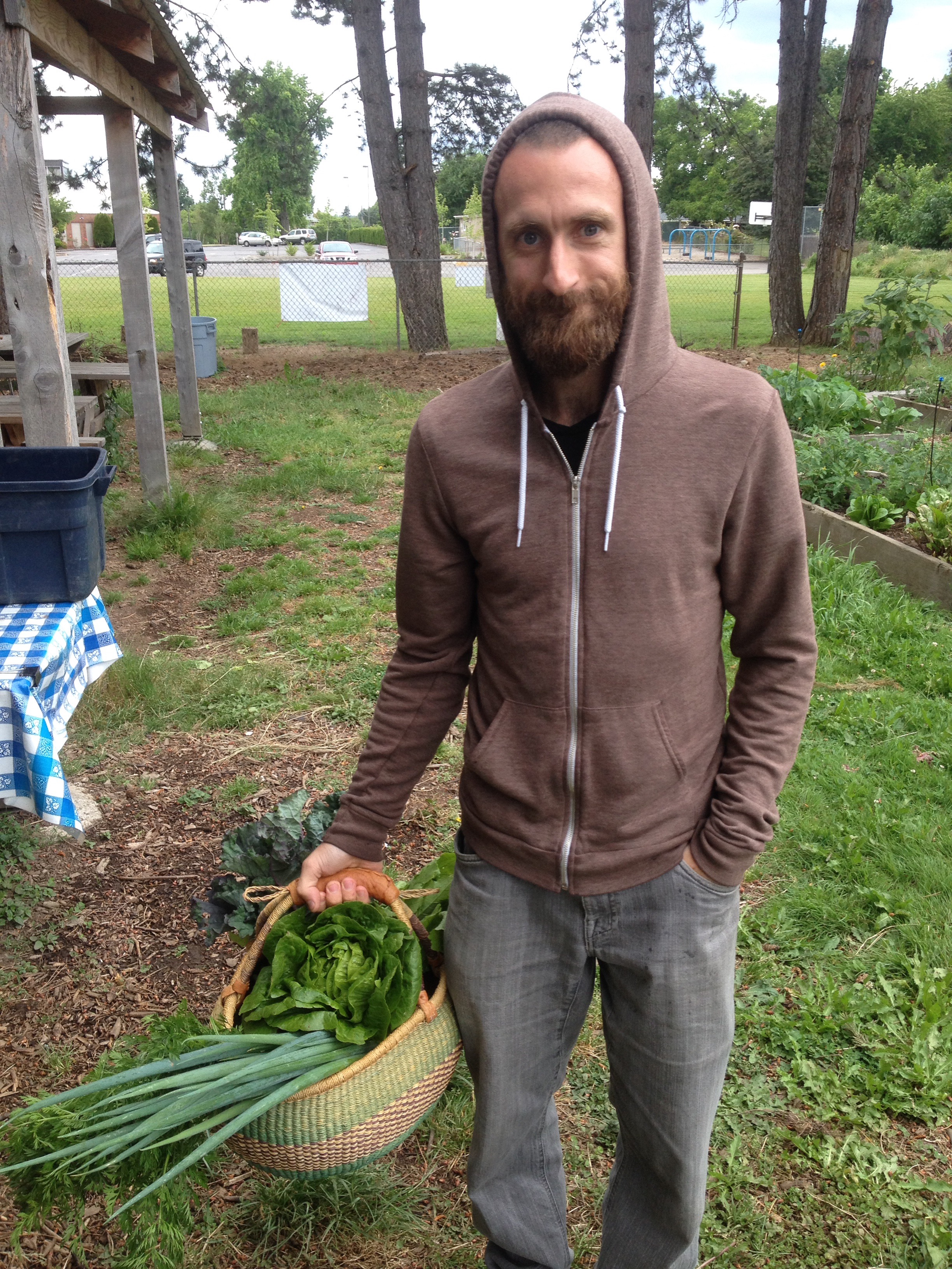 Below: a CSA member going home with a nice basket full of fresh greenery!