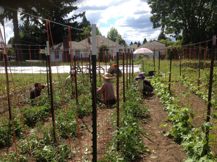 Look at this fabulous scene! Tomato trellising amidst toddlers, bikes, and umbrellas. We had lots of great helpers yesterday during our community farm hours .