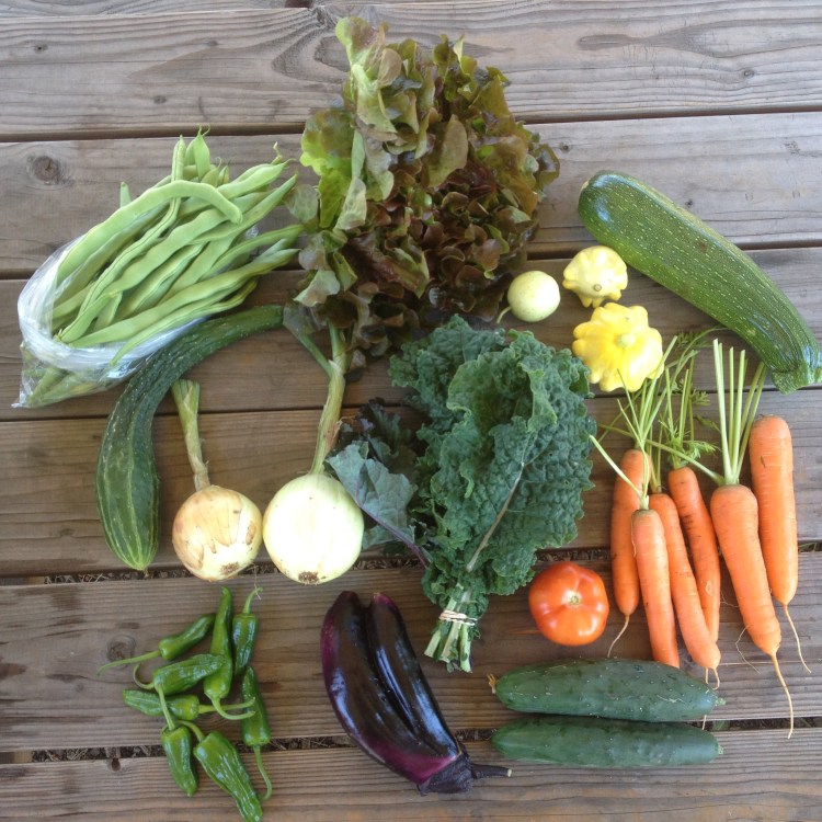 Rounding out the share are the familiar carrots, zucchini (some of you got patty pan summer squash as well), “rainbow lacinato” kale, various cucumbers, 1 tomato, and 1 head of lettuce (some of you got romaine and some red leaf).