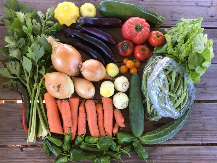 It’s a heavy load of veggies this week! The new addition of celery adds a little more green to the rainbow. They are the outer stalks we removed from the celery plants as we are cleaning up in that planting – good for flavoring soup or broth, adding crunch to a salad, or just eating as a snack. The lettuce ran out Monday so Thursday folks will be getting some cooking greens instead. This week will probably be the last of the green beans for the season (big sigh of relief from the harvest crew!). The carrots had a bit of vole damage so some of them had to be trimmed up. The onions this week are a sweet onion similar to Walla Walla called “Ailsa Craig.” Supposedly they can get really huge, but ours are sort of a normal size this year. The onions are cured now, so you can store them on your counter or in a cupboard. More tomato varieties are coming in week by week, including some Indigo Apple, which has an unusual blue/purple tint on the shoulders. The “indigo” line of tomato varieties are being bred by OSU plant breeder Jim Myers for high levels of anthocyanins, which are antioxidants. The summer squash and cucumbers keep on chugging along, and the sweet peppers are still on their way in – just one per share this week. If you have a pepper that is only partially red, you can let it ripen up to full color at room temperature for a few days. Padron peppers are an optional addition this week. They are a new crop for us this year and seem to be popular with CSA members as well as restaurants, which is great as they are super productive and delicious.