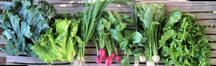 Today’s share was a little different than predicted, but with some nice new items: rainbow lacinato kale, jester lettuce, green onions, pink beauty radishes, first pinch of genovese basil, green garlic, hakurei turnips, basic arugula. I had predicted romaine but we had a bit of insect damage compounded by burning from a boron feeding we did last week. The napa cabbage bolted so failure number two, but the rest of the crops are looking good and we insure ourselves against a few failures by planting diversity so there’s always something good, this week was no exception.