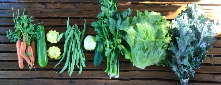 I was surprised to see the Romano beans ready to pick this morning when I got to the farm. The chard was also big enough but due to an excessive number of aphids we switched to kale bunches at the last minute. Lettuce, summer squash and cucumbers are still looking good. Carrots are back and a a little cleaner and bigger than before. We cleaned up the celery today, lots of great flavor in the stalks to add to salads. Basil didn’t make it into the photo but it’s in the Monday share (Thursday got it last week).
