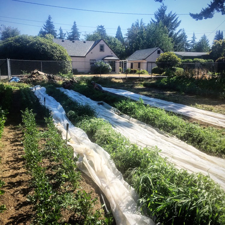 Here’s a rare shot of the crew hand weeding carrots. Thankfully we’ve been able to avoid most hand weeding this year by being good with our timing on hoeing, but the carrots got away from us. Thankfully there was some shade cast on the carrot field to work in yesterday afternoon. It was a hot one. This is the longest consistently hot strong etch I can remember in my 18 years of farming here in the Portland area. Thankfully it is cooling off overnight so the mornings aren’t so bad.