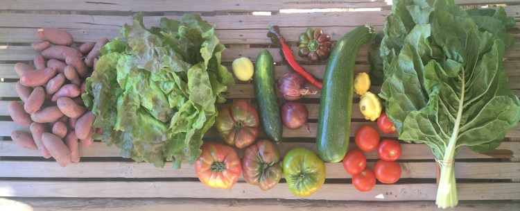A slightly bigger share today than originally planned. We pulled all of the Amarosa fingerling potatoes today so there’s a big pile of those. We’re giving them all out now but they’ll keep in a cool dark place – a cupboard or the fridge – for months if you don’t use them right away. At this point we only have one more variety of potatoes left to dig. Tomatoes are coming in strong right now and the cucumbers and summer squash are still holding on. For the second year in a row the chard is holding well through the summer so big bunches of that, as well as a good sized head of butter lettuce for the greens. All of the onions are out of the ground now and we’re slowly cleaning them. Two red onions in this week’s share. For the most part the onions we’re giving out will also keep well in a corner of the kitchen for at least a few months – the one exception there might be the sweet onions we gave out last week and will probably give out one more time. Sweet peppers are just starting and we’ve got Jimmy Nardellos , which look hot, but are probably the sweetest we grow, and just a few of the first liebesapfels, a nice round paprika type with thick walls.