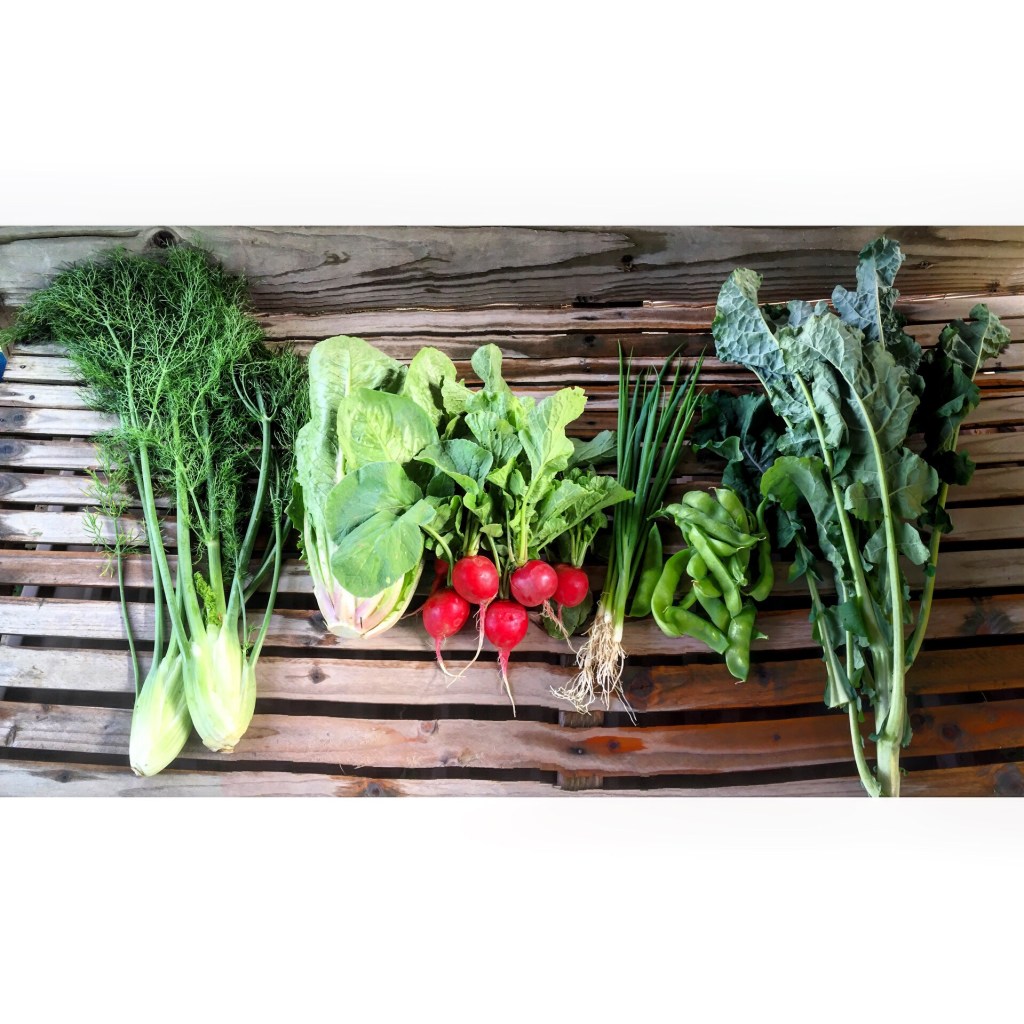 Fennel, lettuce, radishes, green onions, peas, and kale.
