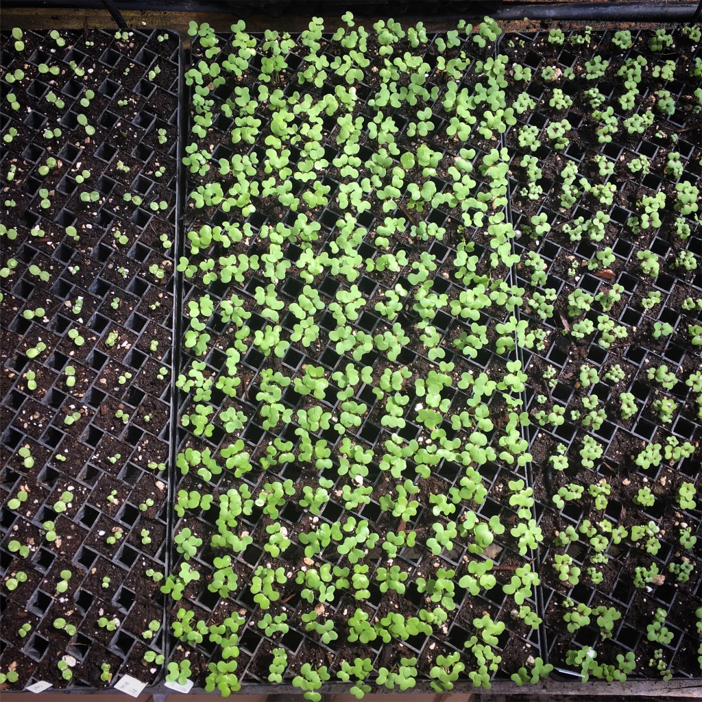 The photo above are of the last three trays of seedlings for planting in our greenhouse – escarole and mustards. They’ll go in the ground in the next week or two and then we’ll have a few more direct seedings before the planting season will be completely finished for us. Yesterday we planted out the first round of escarole, as well as our final round of lettuce. We had a bit of a failure of a large lettuce planting during that last heat wave so we plugged in some extra plants this week and we’ll also direct seed some extra greens as insurance. This cooler weather should be more conducive for some of the greens, but it would be great to get just a little more (moderate) heat and sun in the next month to really set us up well for the fall!