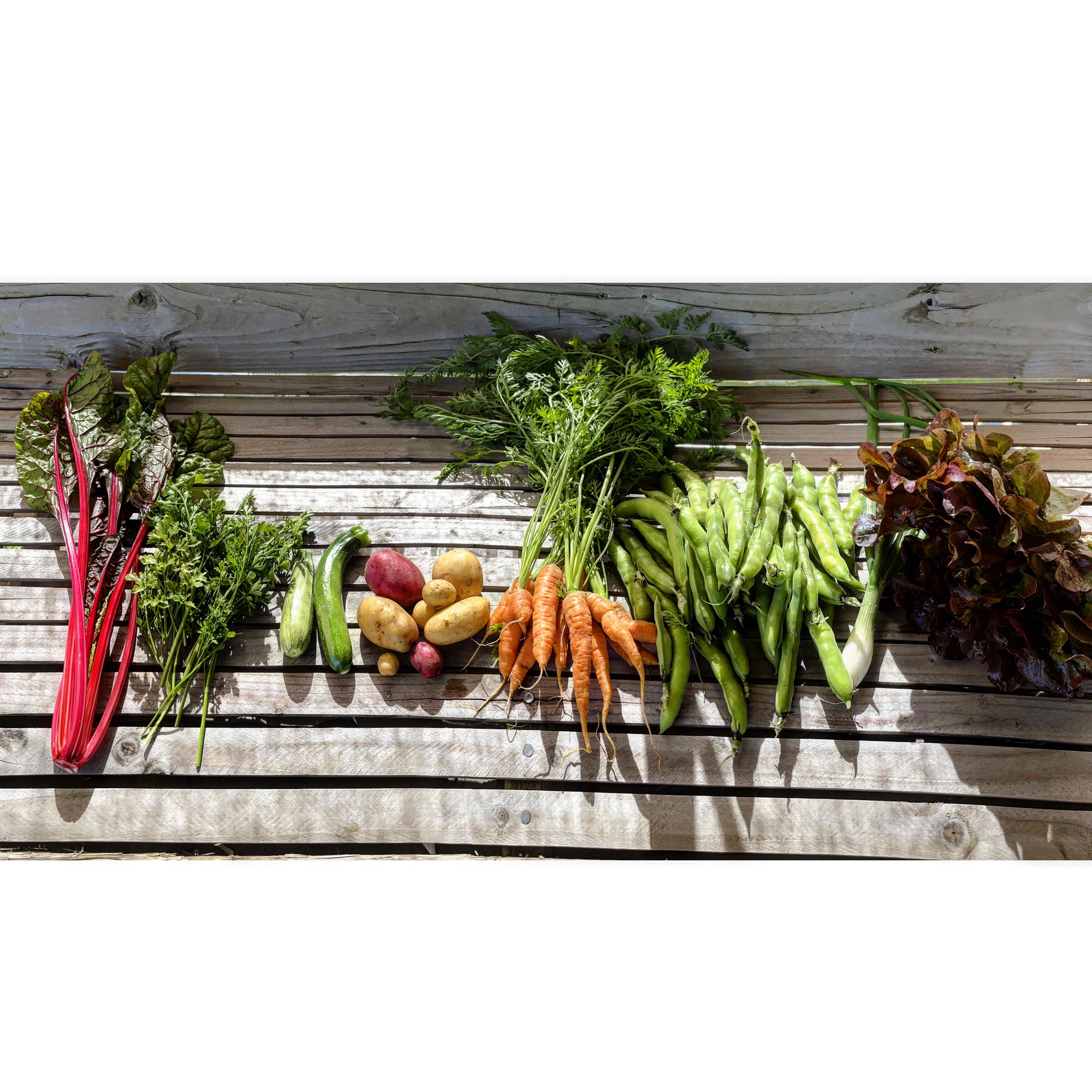 Chard, parsley, summer squash, potatoes, carrots, favas, fresh onion, lettuce.