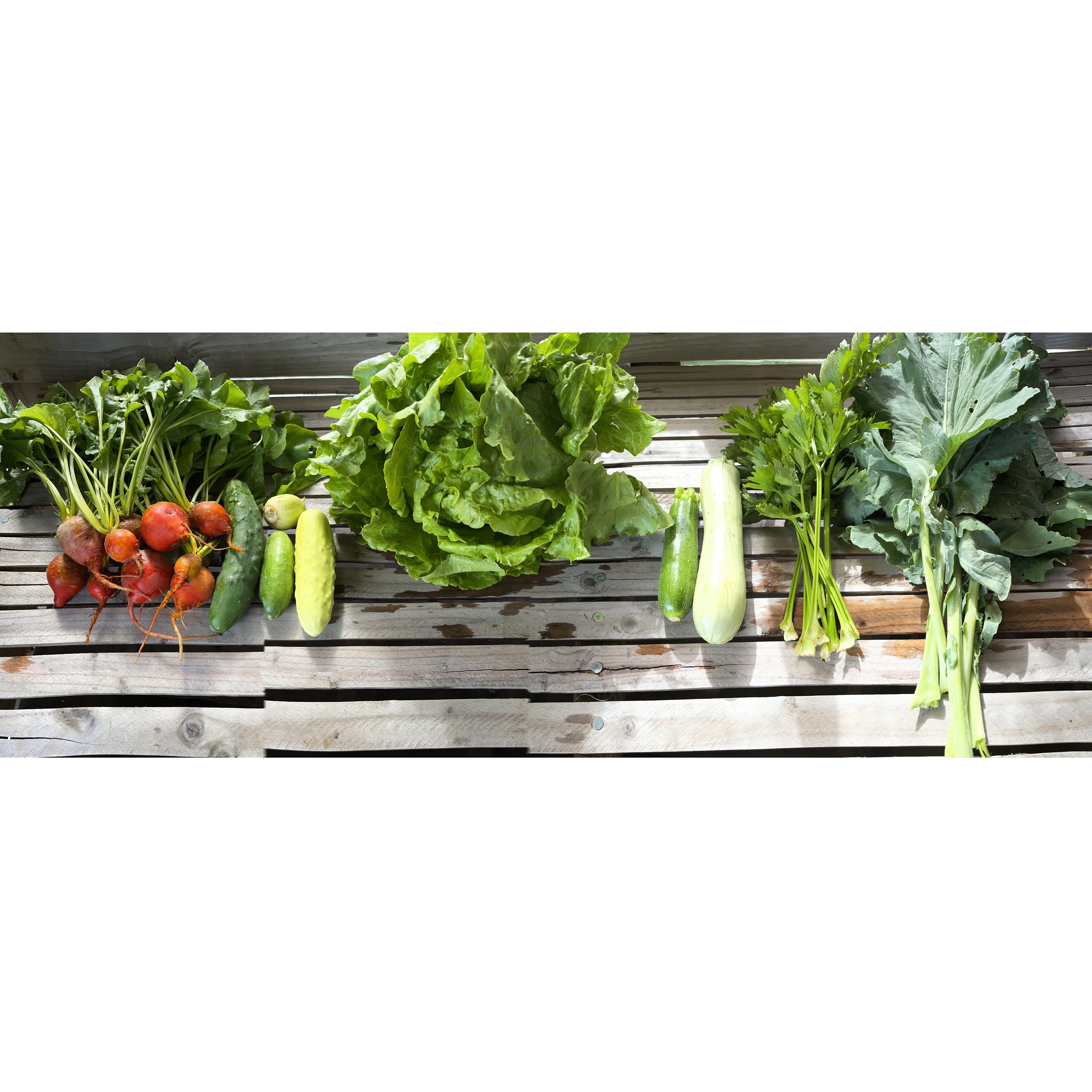 Beets, cucumbers, lettuce, summer squash, celery trimmings, collards. The beans didn’t come on as strongly as I had hoped so not enough for the shares, but we do have some at the farm stand. The favas are on their way out and we’ve opened some of those for gleaning. They’ll probably still be ok on Monday if anyone wants to pick some. We’ve got a pretty decent harvest of Touchstone Gold beets, after a less impressive round of spring beets it’s nice to see these sized up and I’ve been enjoying them in salads! We’re growing four different cucumbers this year and they’re all pictured here. We didn’t have enough for everyone to get every kind but you’ll see all of them at some point. The Nevada lettuce is quite large this week, perfectly crisp for big salads. We’re growing three summer squash, and the two zucchini shown here are the earlier varieties, with patty pans coming soon. The first planting of celery is starting to size up and this first harvest is of side shoots which are great for flavoring salads or soups. The flavor is much more intense than what you typically get in the store even through the size in much smaller. We’re clearing out the last of the spring planted collards and they’re doing well with this heat. We’ll also have lots more of these in the fall – and maybe even this summer as the later planting already has some pretty big leaves.