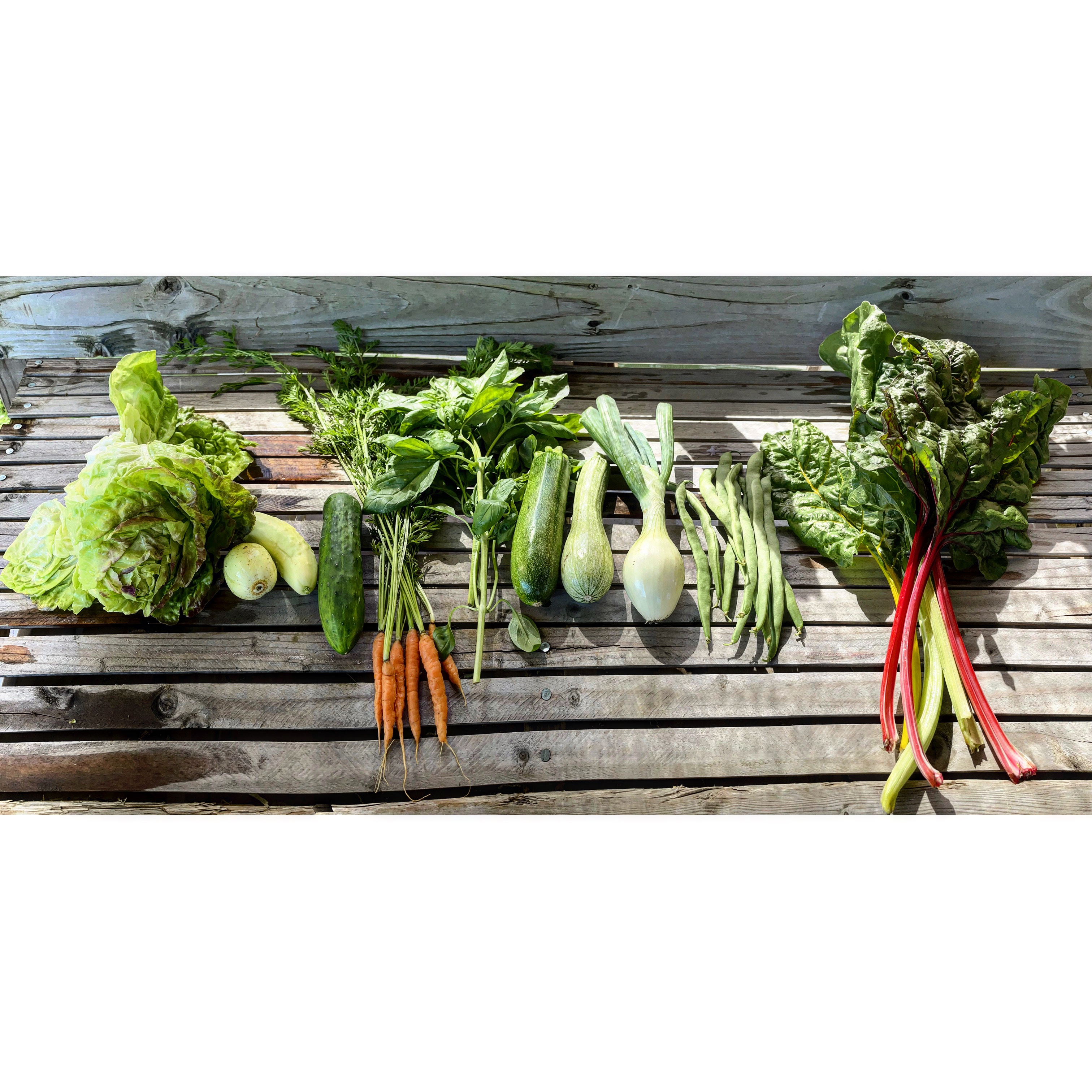 Lettuce, cucumbers, baby carrots, basil, summer squash, Romano beans, and chard. The lettuce today is red butter and it was on the edge of bolting so I’m not sure if that’ll be the lettuce we have on Monday. The romaine lettuce that was planned for the share all bolted which may have been the worst part of this heat wave. The best part of the heat wave is that the basil looks very happy, and the cucumbers and summer squash seem to be doing better. We got just enough Romano beans today to give some in the share and I’m hoping we’ll get more on Monday. I think I explained the baby carrots in the last post – basically a reseed of a failed early seeding this spring that haven’t had time to really size up before we needed to clear the bed for planting fall and winter crops, and they were probably also stunted by heavy weed pressure. Have I mentioned how bad the weed pressure has been this year – worse than I’ve seen it in many, many years.