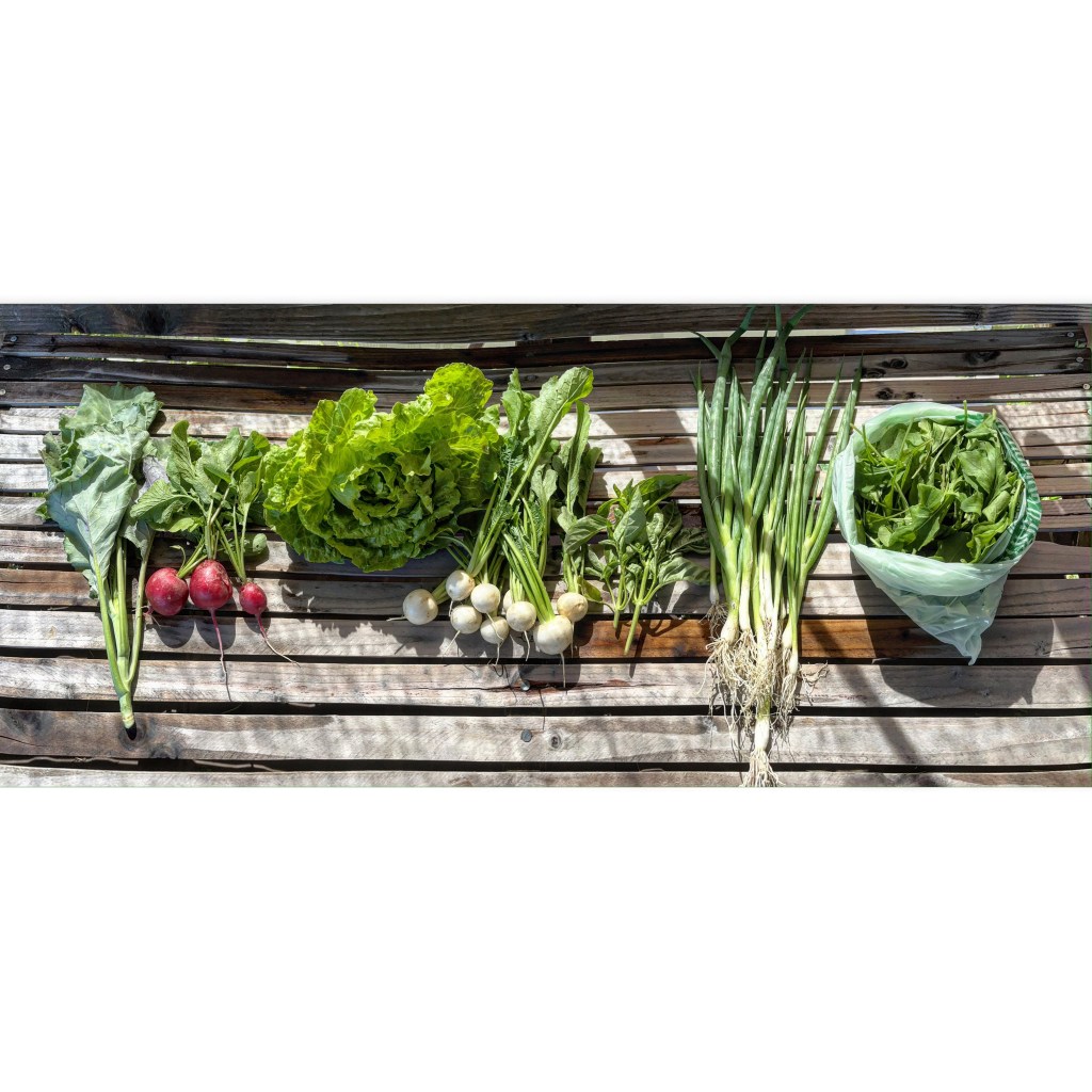 Collards, radishes, lettuce, turnips, basil green onions and arugula. This was the final week for our A schedule spring shares, B schedule’s final week is next week and the share should be similar. Not pictured is Kohlrabi and I’m not sure if more will size up in time for next week’s shares. It’s possible we might have fennel or beets instead. We’re also very close to the first summer squash of the year.
