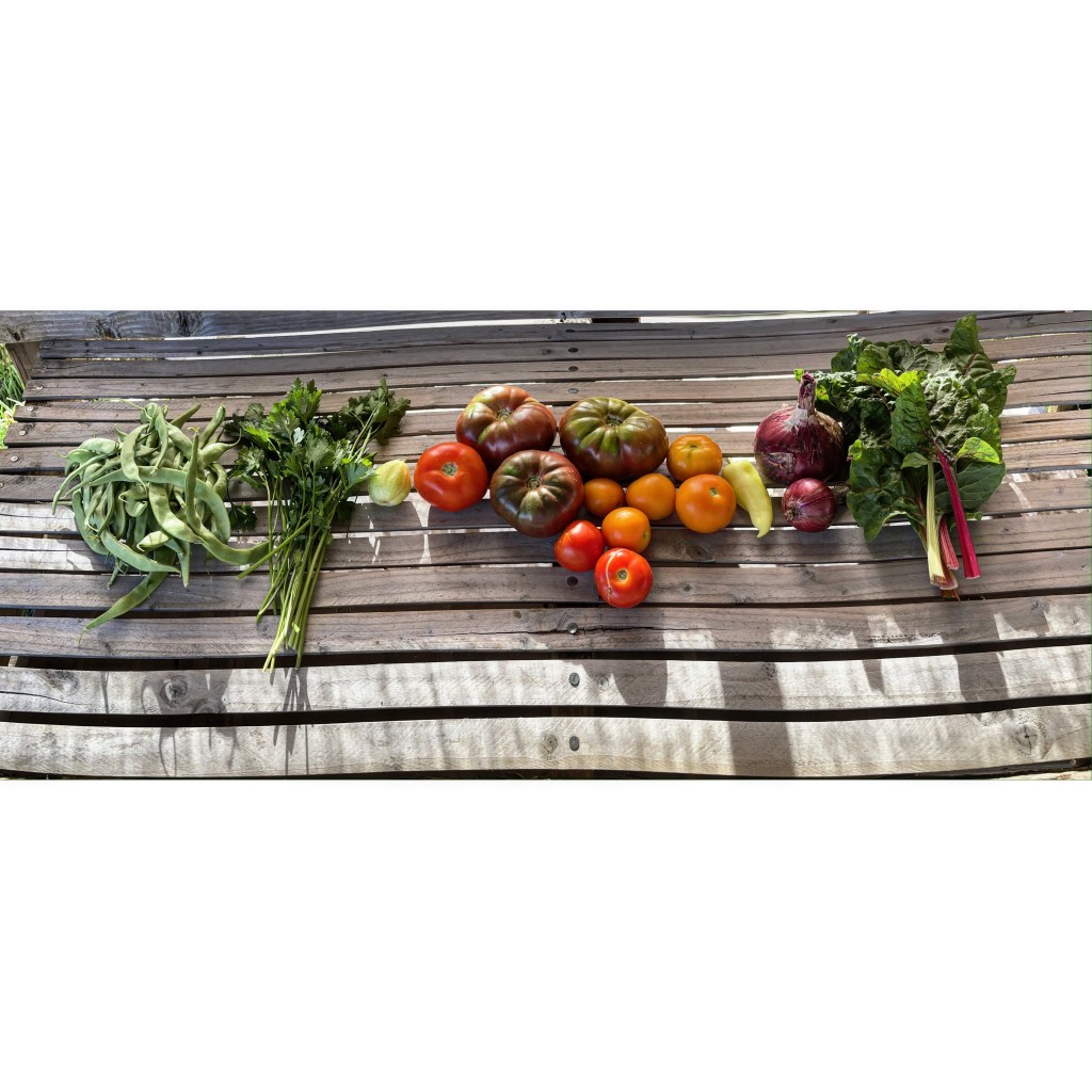 The shares continue to be much smaller than I’d like, but as always they’re a reflection of where we are in the season. Romano beans, parsley, lemon cucumber, tomatoes, pepper, red onions, chard and summer squash (not pictured). Tomatoes came on strong today and again we have a good sized share of romano beans. Today is getting chard, as did last Thursday, and Thursday and next Monday will probably see kale before lettuce returns. Our fall parsley is looking nice so we put a small bunch in. The sweet peppers are definitely behind this year as they got off to a very slow start. We needed to thin fruit from the plants so there’s a small gypsy pepper in most shares and a few folks got a Jimmy Nardello, just little teaser really. The cucumbers and summer squash, which were both waning a bit anyway, seem to have not enjoyed the heat so just a lemon cucumber and choice of summer squash in the shares today. This may be the final week for cucumbers in the share unless they unexpected bounce back, and summer squash isn’t far behind.