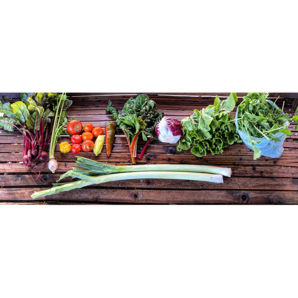 Beets, turnip, tomatoes, sweet peppers, chard, radicchio, escarole, arugula and leeks. A mix of things that are still hanging on from summer, things planned for later, and a few of the items we expected. The tomatoes and sweet peppers have held on for longer than expected due to the warm nights we’ve been having. It looks like that will end this weekend, and the reality is that they’ve slowed down so much now and the forecasted cold weather means that this is almost certainly the last we’ll see of them this year. The turnip in this week’s share is from a section of winter turnips we needed to thin, and it’s a very different turnip from the salad turnips, which weren’t ready for a second harvest – unfortunately when we uncovered that section of winter turnips we also found a lot of damage from pests, likely also partially due to the warm weather we’ve been having. Another result of the warm weather, the earliest radicchio is ready a few weeks before planned. That meant two of my favorite chicories in the shares – escarole and radicchio!