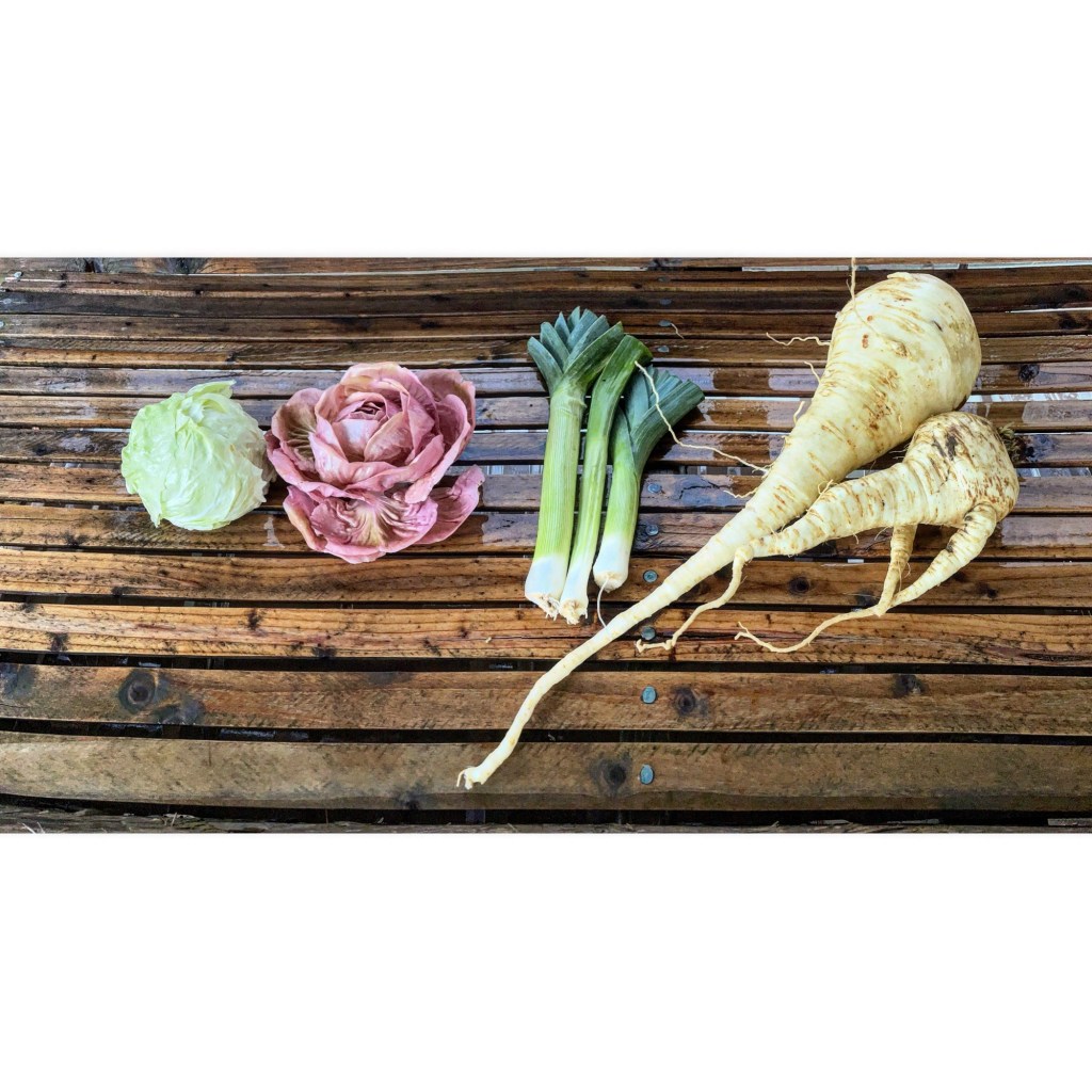 Just three items today: Radicchio, parsnips and leeks. These were the last of the radicchio and shown is palla di neve, one of the less showy green Chioggia types but definitely a hearty and delicious variety, and Rosato, one of the newer pink Verona types. I’ve been a little late to appreciating the pink varieties as I didn’t think the ones I tried when they first came out about 10 years ago tasted very good, but this one is winning me over after a good number made it through the freeze – plus they are really beautiful. Some folks got red Verona types, variegated chioggias or castlefranco. We also harvested the remaining beets but there was quite a bit of freeze damage so we offered them as seconds to anyone who wanted a project trimming out the damage.