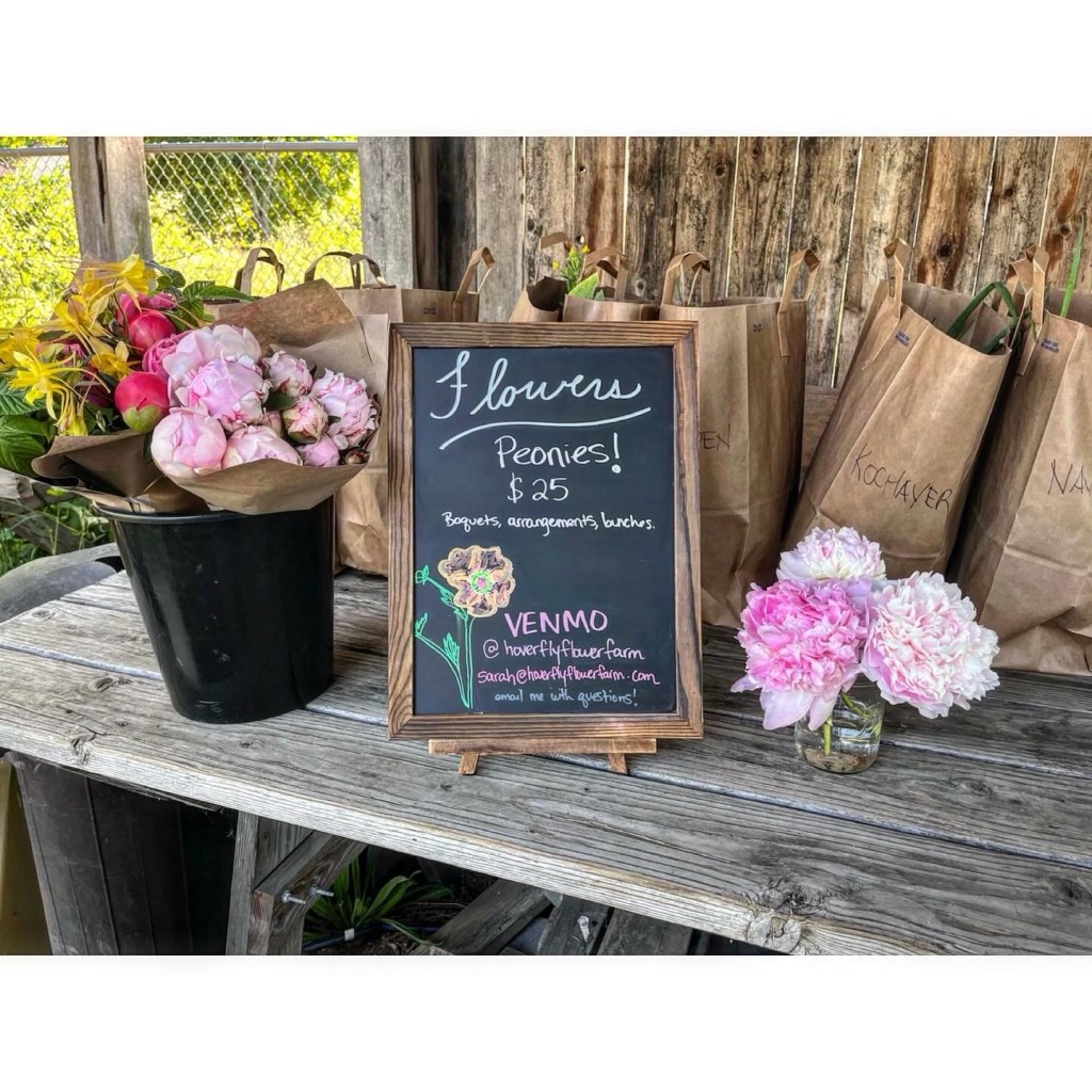Speaking of the farm stand, Sarah from Hoverfly Flower Farm has been bringing beautiful bouquets to the farm stand and this evening she left the extras with payment instructions at the after hours pick up in case anyone picking up after-hours wants a bouquet. Our neighbors Golden Age Kombucha have also been stocking their little cooler on the farm during farm stand hours so check that out next time you pick up.