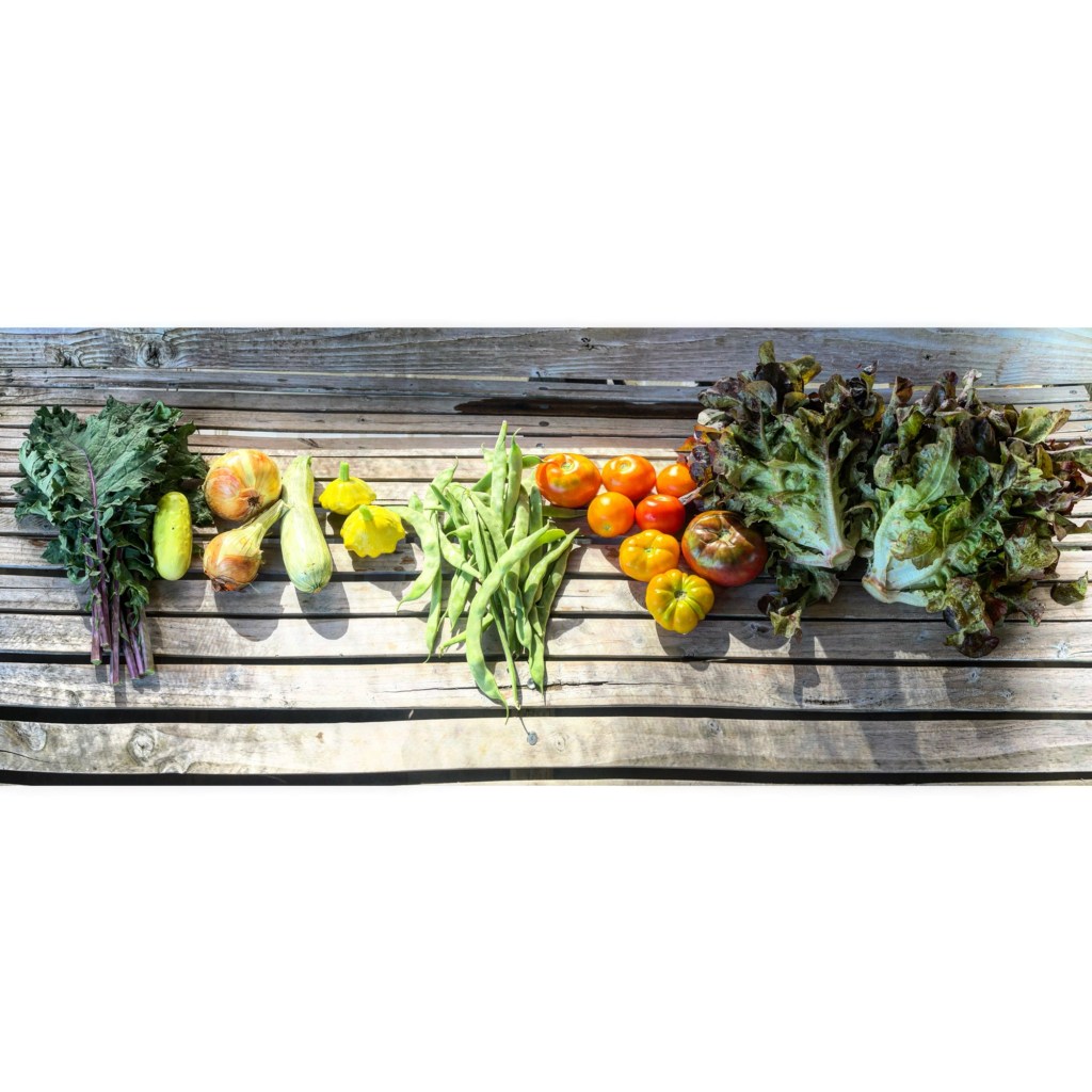 Kale or chard, cucumber, yellow onions, summer squash, romano beans, tomatoes and lettuce. Thursday’s share will probably be similar, but may not have the romano beans and second head of lettuce, and if we get lucky there will be the first sweet peppers of the year. Usually I plan for just one head of lettuce in the shares but recently we’ve had excess in the field and I didn’t want it to go unharvested so there have been a number of days where two heads show up. I don’t think that will happen much more this year, but you never know. The kale is still a little small but it needed some initial clean up so I harvested some bunches of that and then went through the chard patch to get the rest. The chard is looking great right now after that little bit of rain and this cooler weather. Cucumbers and summer squash are slowing down just as tomatoes and peppers are picking up.