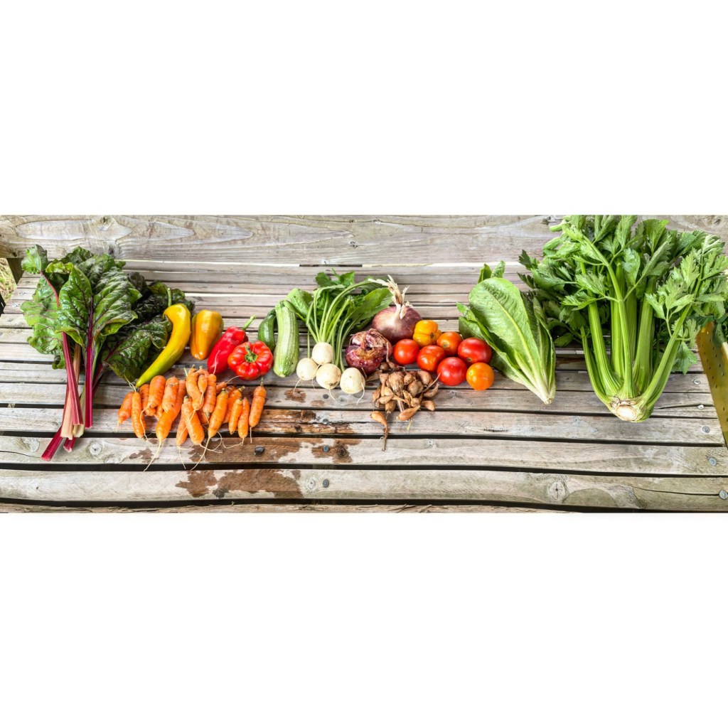 Chard, carrots, sweet peppers, summer squash, salad turnips with greens, two types of shallot, tomatoes, romaine lettuce and celery. We’ve been having a bit of trouble with lettuce bolting this year, especially after each bout of heat, and it seems that’s continuing this fall with our warmer than usual days this Septemeber. That heat definitely ripened a lot of peppers and tomatoes though. There are two types of shallot in the share, the last of the little true shallots, also called French Grey Shallots, and the much larger, more onion like Ed’s Red. The true shallots aren’t great keepers but the Red shallots are.