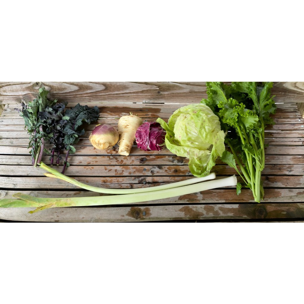 A smaller number of items in the share this week, but most of them are bulky and/or heavy. That combined with the wet weather means we’re having an unusually high incidence of bag blowouts so be careful when picking up your share bag. In the bags are kale, rutabaga, parsnip, radicchio, green mustard and leeks. Kohlrabi showed up on the farm stand as promised. The kale bunches are a mix of winter red kale and lacinato rainbow. There are two heads of radicchio and it’s looking great right now! Pictured are Lusia and Chioggia types, but some folks are getting Verona. They’re all great and we should have more of all of them as well as some more varieties in the future. The super long Lincoln leeks will be finished after next week’s share so these are the last of them before we switch to our winter leek variety. Rutabagas are looking about as good as I’ve ever seen them and if you haven’t had them before I’d suggest chunking them up and roasting them with olive oil. You could do that with the parsnips too. Both also make good purees.